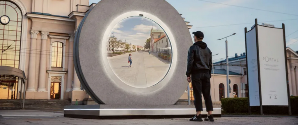 Înstalația din piatră circulară creează un podul virtual care permite locuitorilor capitalei lituaniene să vadă și să comunice vizual cu trecătorii care stau la „celălalt capăt” al portalului, la mai mult de 550 km distanță.