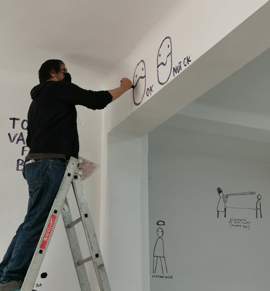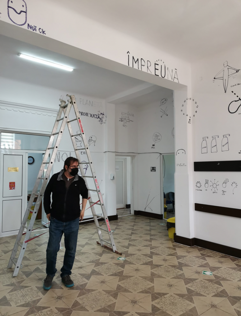 Dan Perjovschi a desenat pe pereții unui centru de vaccinare CoVid